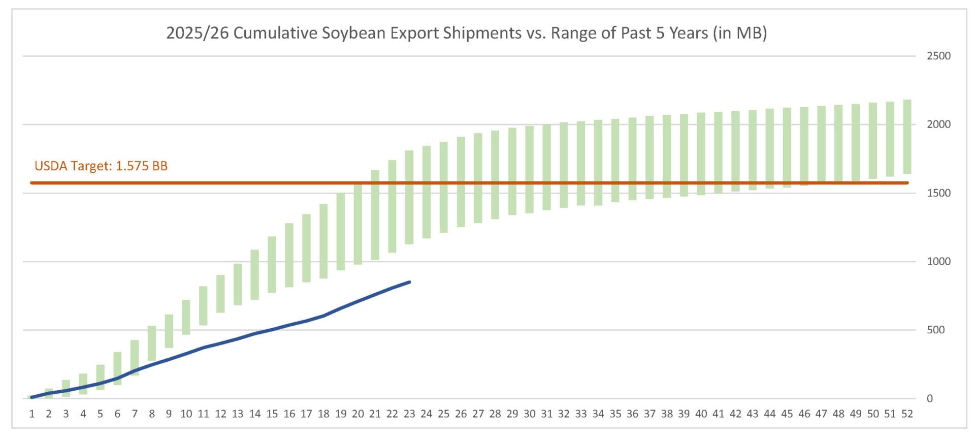 Last week’s soybean export shipments pace was estimated at 41.7 MB. After 23 weeks, soybean shipments were at 54% of USDA’s expectations vs. 69% last year. With 29 weeks left in soybeans’ export marketing year, shipments need to average 25.0 MB to make USDA’s projection of 1.575 BB.
