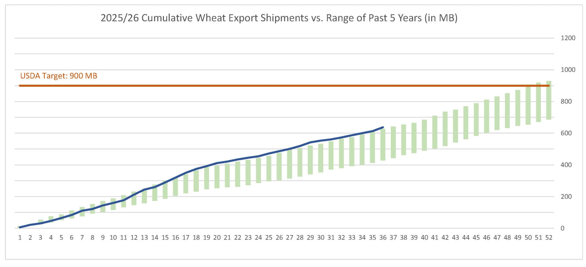 Last week’s wheat export shipments pace was estimated at 21.3 MB. After 36 weeks, wheat shipments were at 71% of USDA’s expectations vs. 65% last year. With 16 weeks left in wheat’s export marketing year, shipments need to average 16.5 MB to make USDA’s projection of 900 MB.