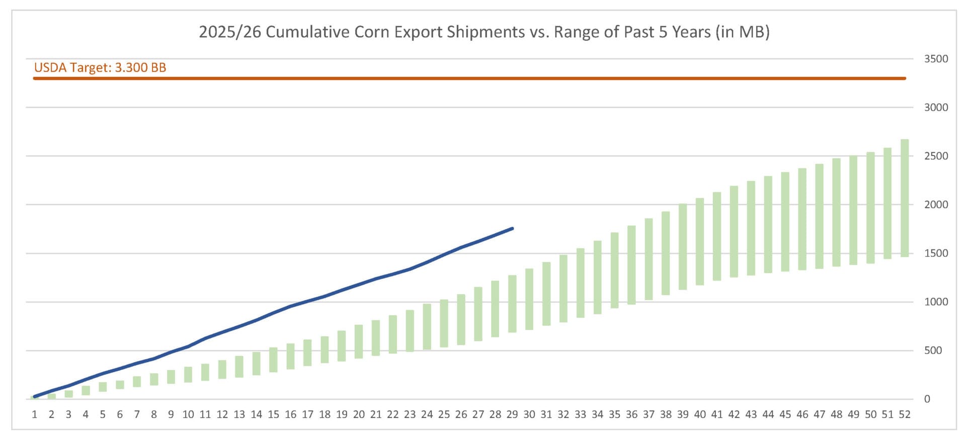 Last week’s corn export shipments pace was estimated at 66.9 MB. After 29 weeks, corn shipments were at 53% of USDA’s expectations vs. 45% last year. With 23 weeks left in corn’s export marketing year, shipments need to average 67.2 MB to make USDA’s projection of 3.300 BB.