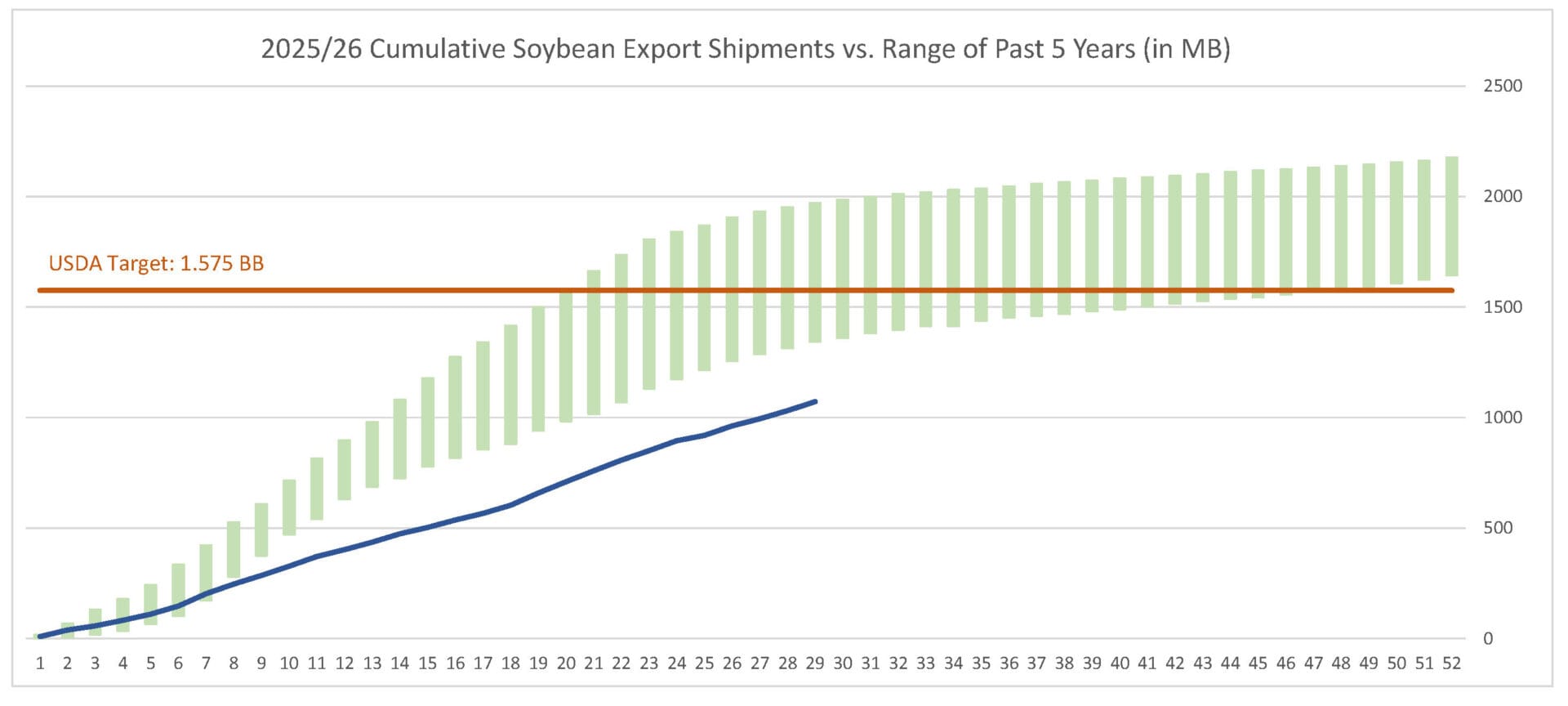 Last week’s soybean export shipments pace was estimated at 40.5 MB. After 29 weeks, soybean shipments were at 68% of USDA’s expectations vs. 78% last year. With 23 weeks left in soybeans’ export marketing year, shipments need to average 21.9 MB to make USDA’s projection of 1.575 BB.