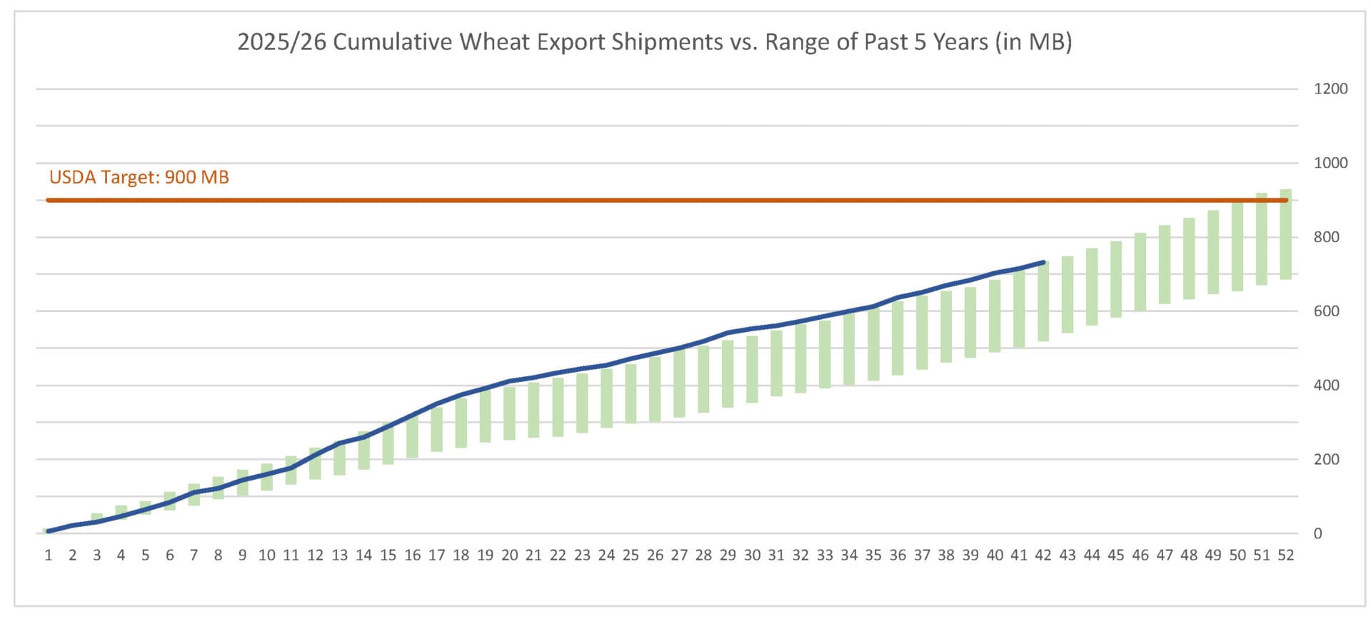 Last week’s wheat export shipments pace was estimated at 16.8 MB. After 42 weeks, wheat shipments were at 81% of USDA’s expectations vs. 75% last year. With 10 weeks left in wheat’s export marketing year, shipments need to average 16.8 MB to make USDA’s projection of 900 MB.