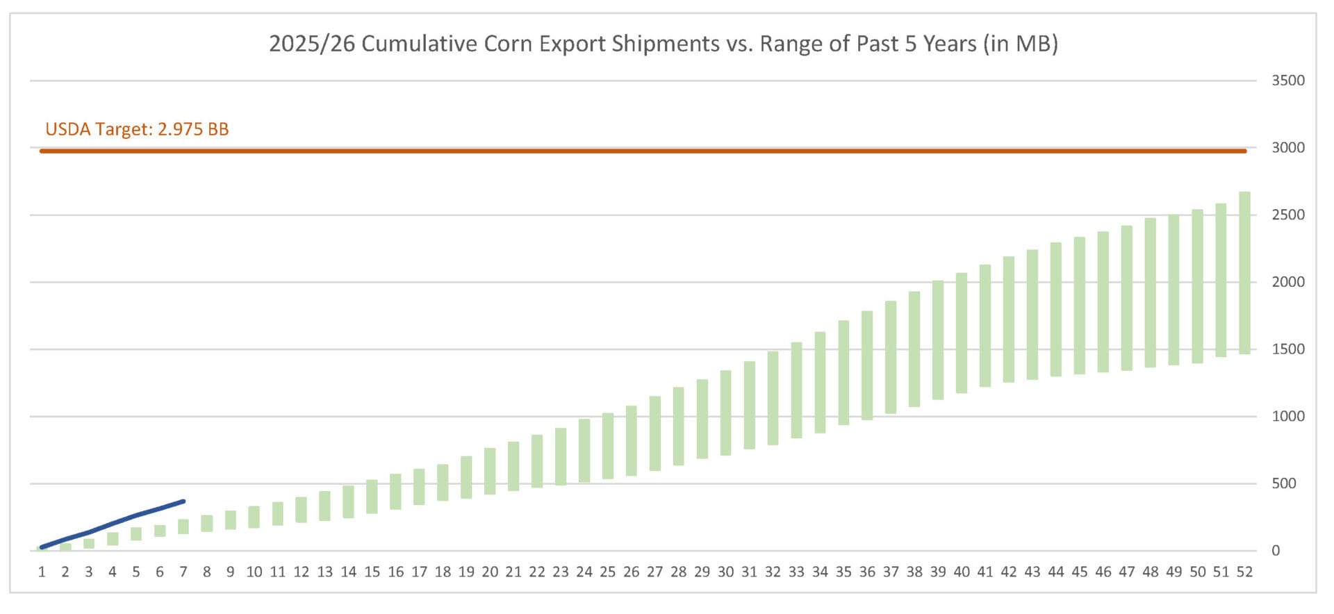 Last week’s corn export shipments pace was estimated at 51.9 MB. After 7 weeks, corn shipments were at 12% of USDA’s expectations vs. 8% last year. With 45 weeks left in corn’s export marketing year, shipments need to average 57.9 MB to make USDA’s projection of 2.975 BB.