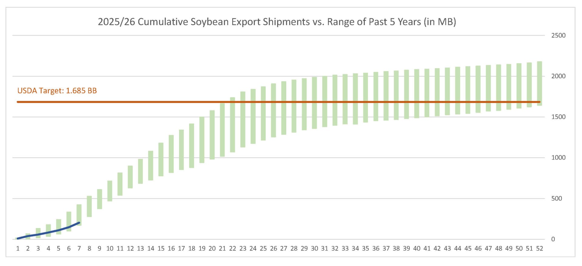 Last week’s soybean export shipments pace was estimated at 54.2 MB. After 7 weeks, soybean shipments were at 12% of USDA’s expectations vs. 16% last year. With 45 weeks left in soybeans’ export marketing year, shipments need to average 32.9 MB to make USDA’s projection of 1.685 BB.