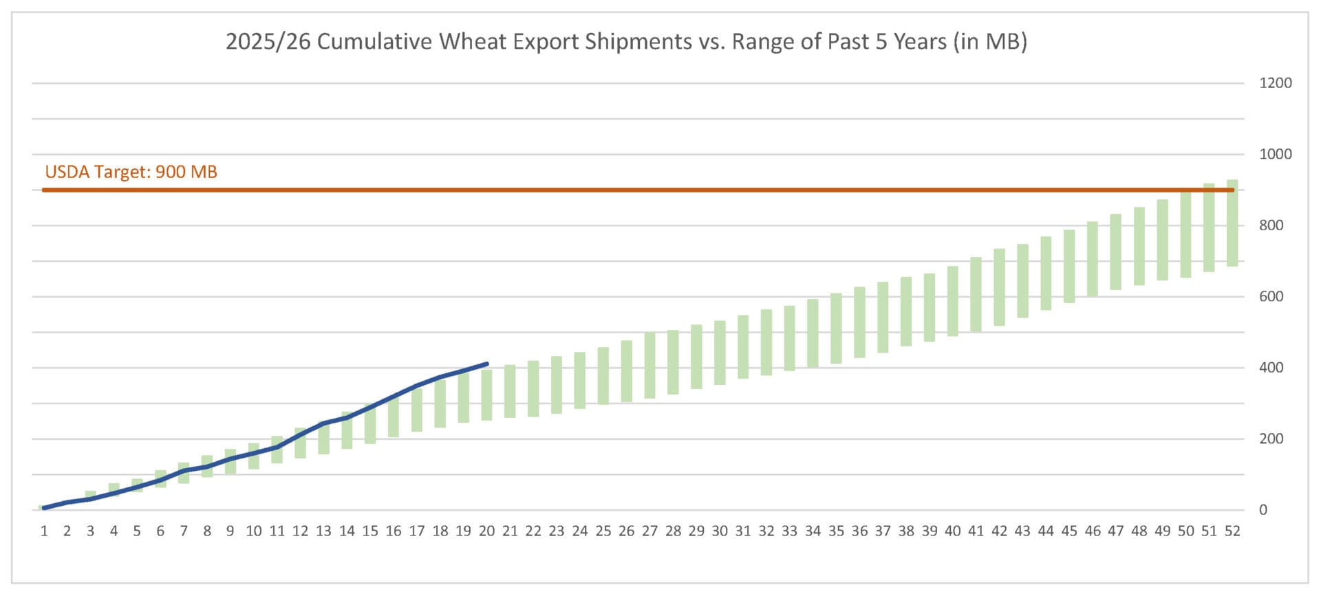 Last week’s wheat export shipments pace was estimated at 17.7 MB. After 20 weeks, wheat shipments were at 49% of USDA’s expectations vs. 41% last year. With 32 weeks left in wheat’s export marketing year, shipments need to average 15.3 MB to make USDA’s projection of 900 MB.