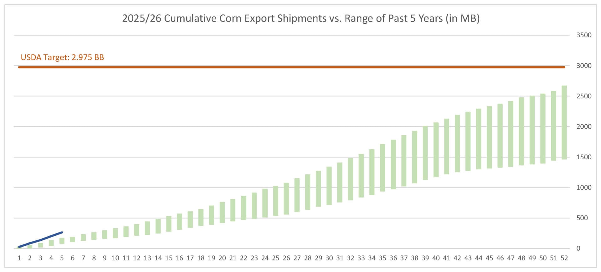 Last week’s corn export shipments pace was estimated at 63.0 MB. After 5 weeks, corn shipments were at 9% of USDA’s expectations vs. 6% last year. With 47 weeks left in corn’s export marketing year, shipments need to average 57.7 MB to make USDA’s projection of 2.975 BB.