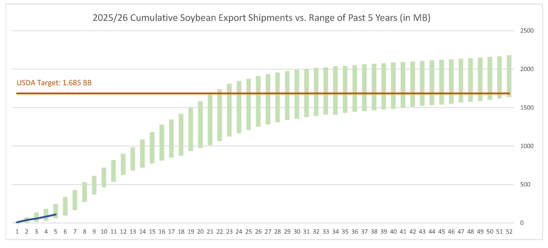 Last week’s soybean export shipments pace was estimated at 28.2 MB. After 5 weeks, soybean shipments were at 7% of USDA’s expectations vs. 7% last year. With 47 weeks left in soybeans’ export marketing year, shipments need to average 33.5 MB to make USDA’s projection of 1.685 BB.