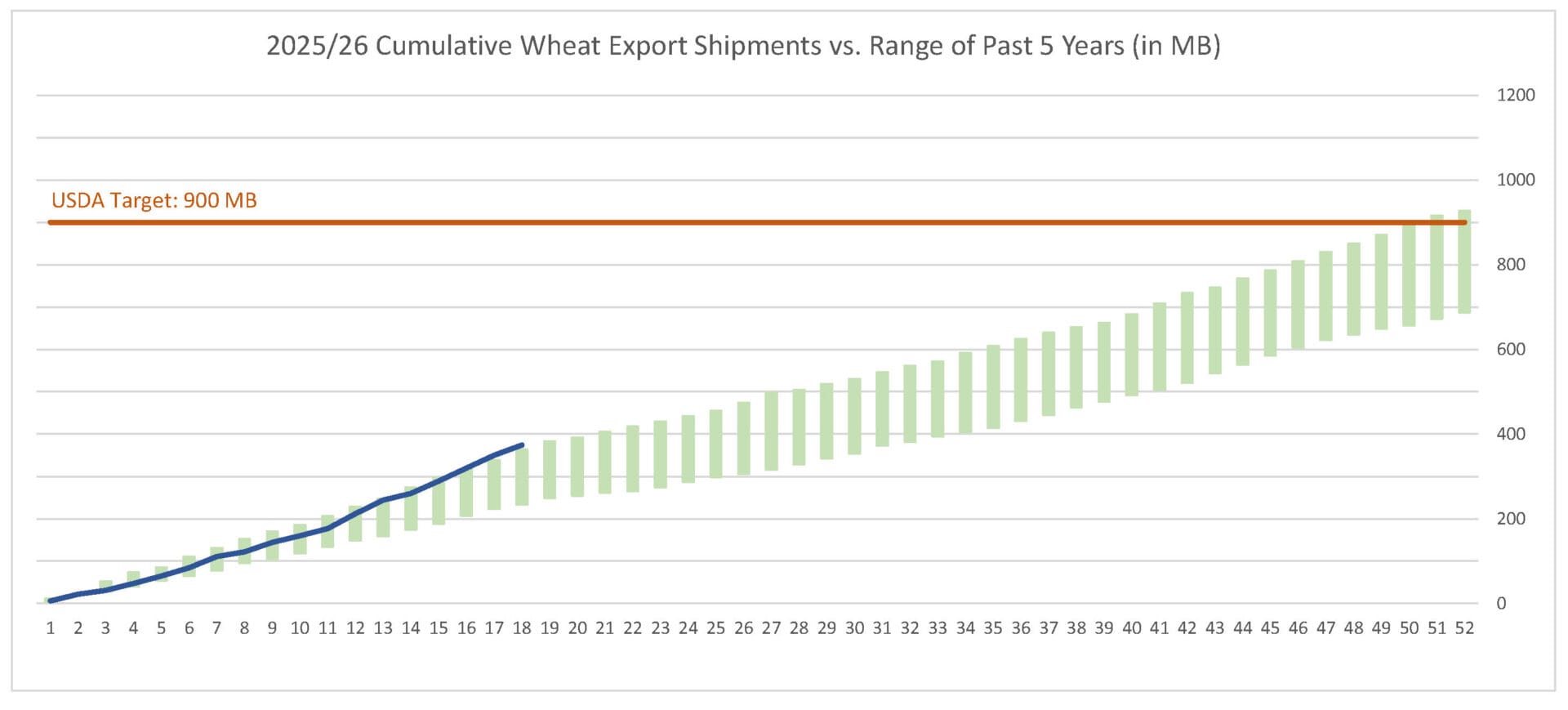 Last week’s wheat export shipments pace was estimated at 18.6 MB. After 18 weeks, wheat shipments were at 42% of USDA’s expectations vs. 38% last year. With 34 weeks left in wheat’s export marketing year, shipments need to average 15.5 MB to make USDA’s projection of 900 MB.