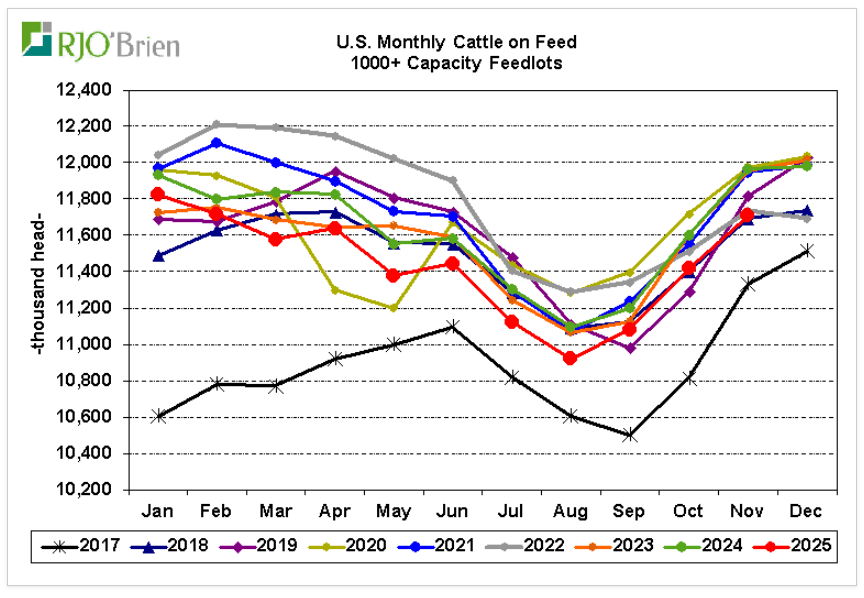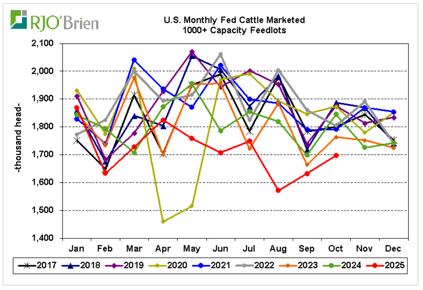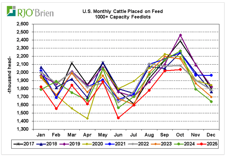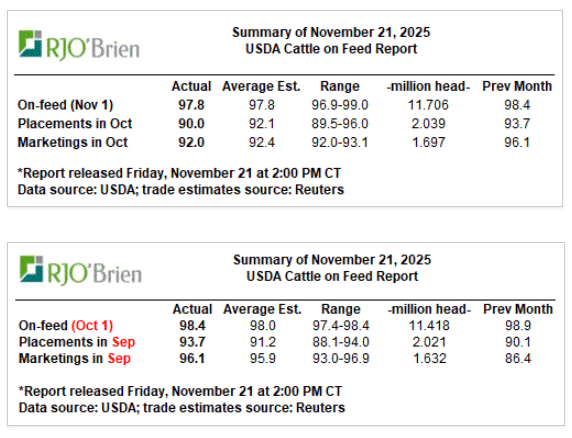 NOTE: The USDA’s Cattle on Feed report issued this afternoon included data for Nov 1 and Oct 1 On Feed as last month’s report was not issued due to the government shutdown. A summary of the data which would have been released in the October report is also provided below.