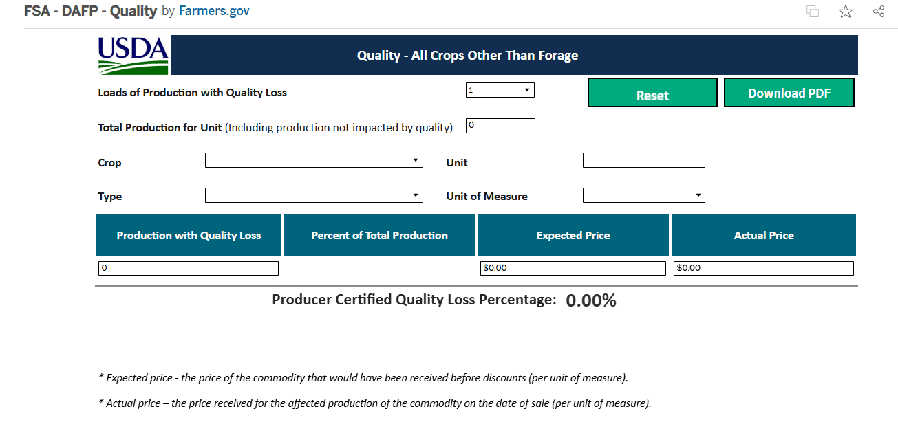 - That info needs to be entered into FSA’s online calculator that can be found here: https://public.tableau.com/app/profile/farmers.gov/viz/FSA-DAFP-Quality/Quality-AllCropsOtherThanForage