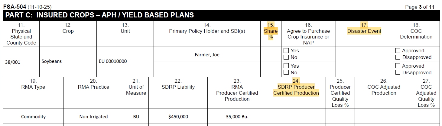 Like Stage 1, you will need to complete the share percentage (box 15) and disaster event (box 17) boxes. The disaster qualifying events are the same as Stage 1. In our area, drought or excess moisture are the qualifying events. You can only use drought if your county is listed here: https://www.fsa.usda.gov/tools/informational/fact-sheets/supplemental-disaster-relief-program-drought-eligible-counties-2023.