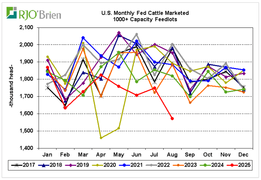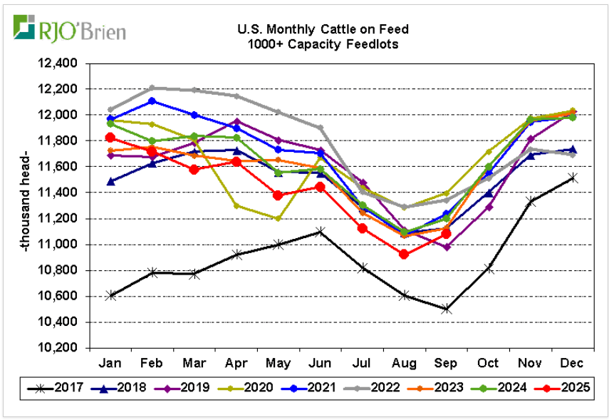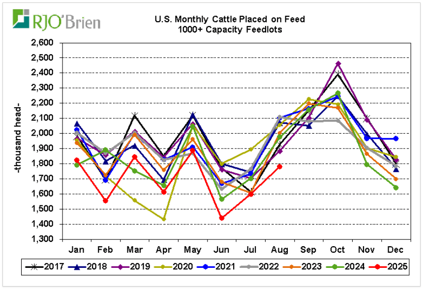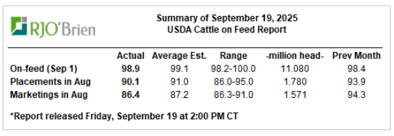 The Sept COF report was neutral to friendly cattle as the numbers came in close to expectations. Estimates for the report were On Feed: 99% (as expected), Placed: 90% (1% below expectations), and Marketing: 86% (1% below expectations).