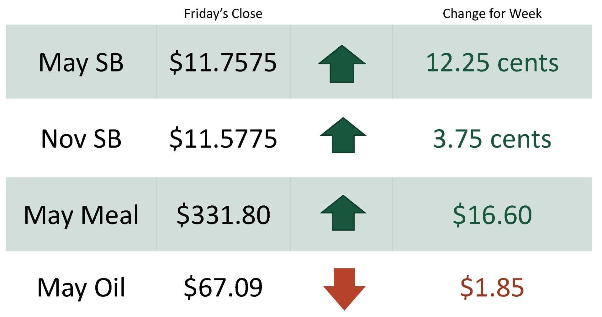 For the week, May soybeans were at $11.7575 up 12.25 cents while Nov soybeans were at $11.5775 up 3.75 cents. May soybean meal was at $331.80 up $16.60 and May soybean oil was at $67.09 down $1.85.