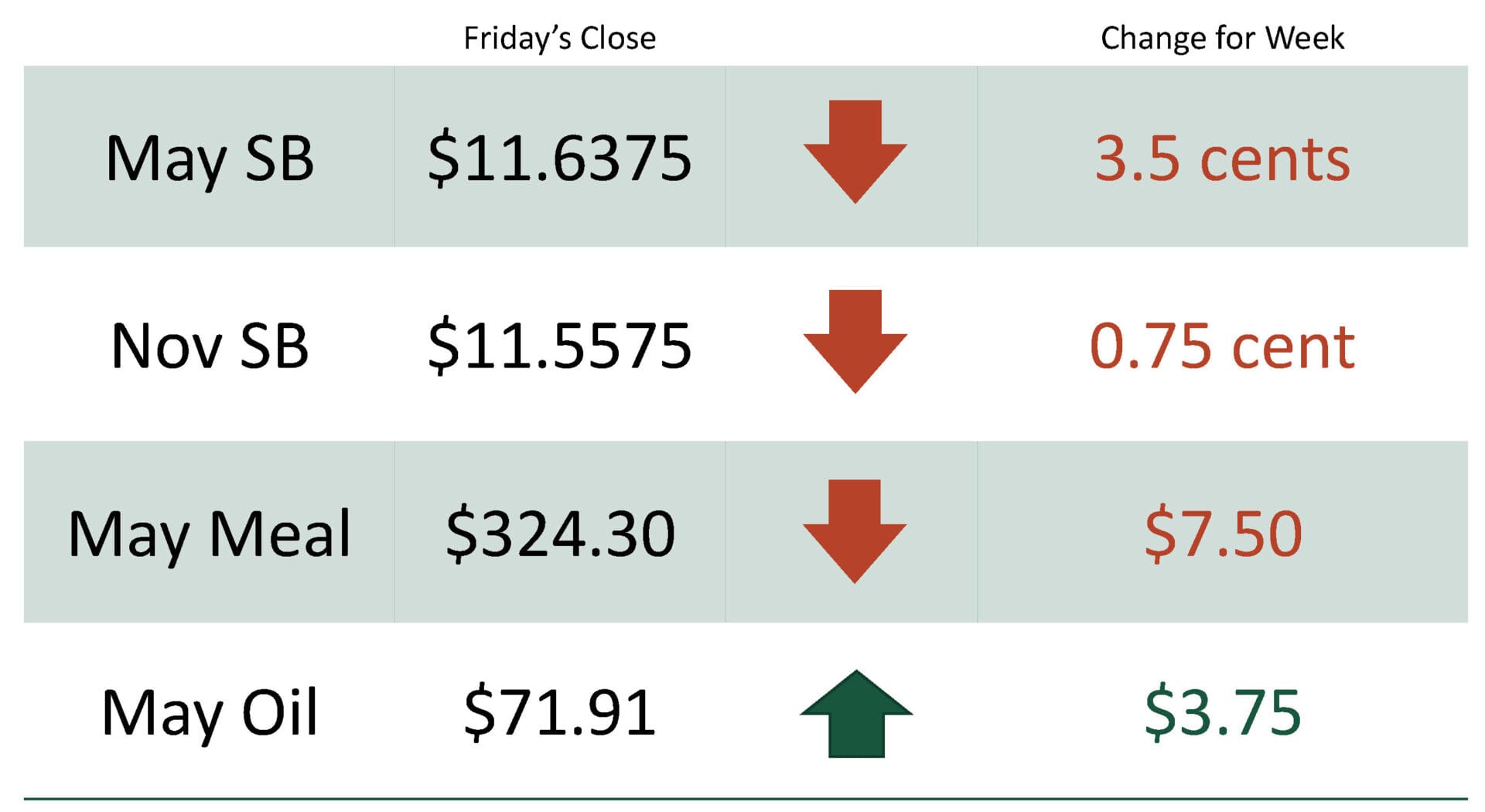 For the week, May soybeans were at $11.6375 down 3.5 cents while Nov soybeans were at $11.5575 down 0.75 cent. May soybean meal was at $324.30 down $7.50 and May soybean oil was at $71.91 up $3.75.