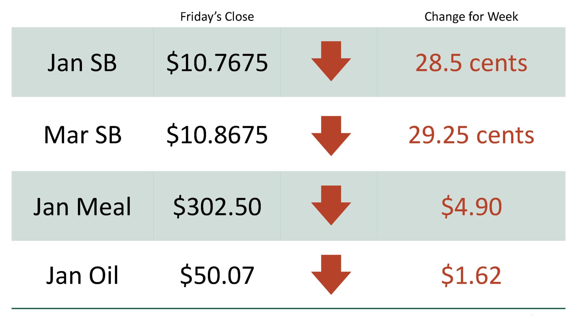 For the week, January soybeans were at $10.7675 down 28.5 cents while March soybeans were at $10.8675 down 29.25 cents. January soybean meal was at $302.50 down $4.90 and January soybean oil was at $50.07 down $1.62.