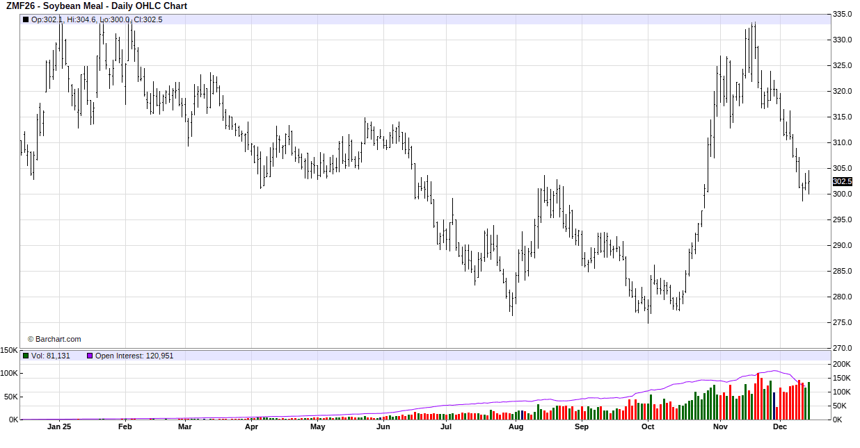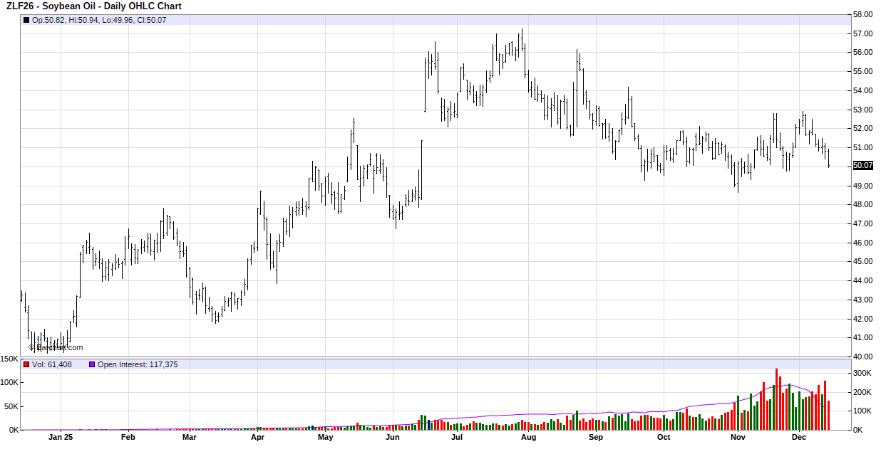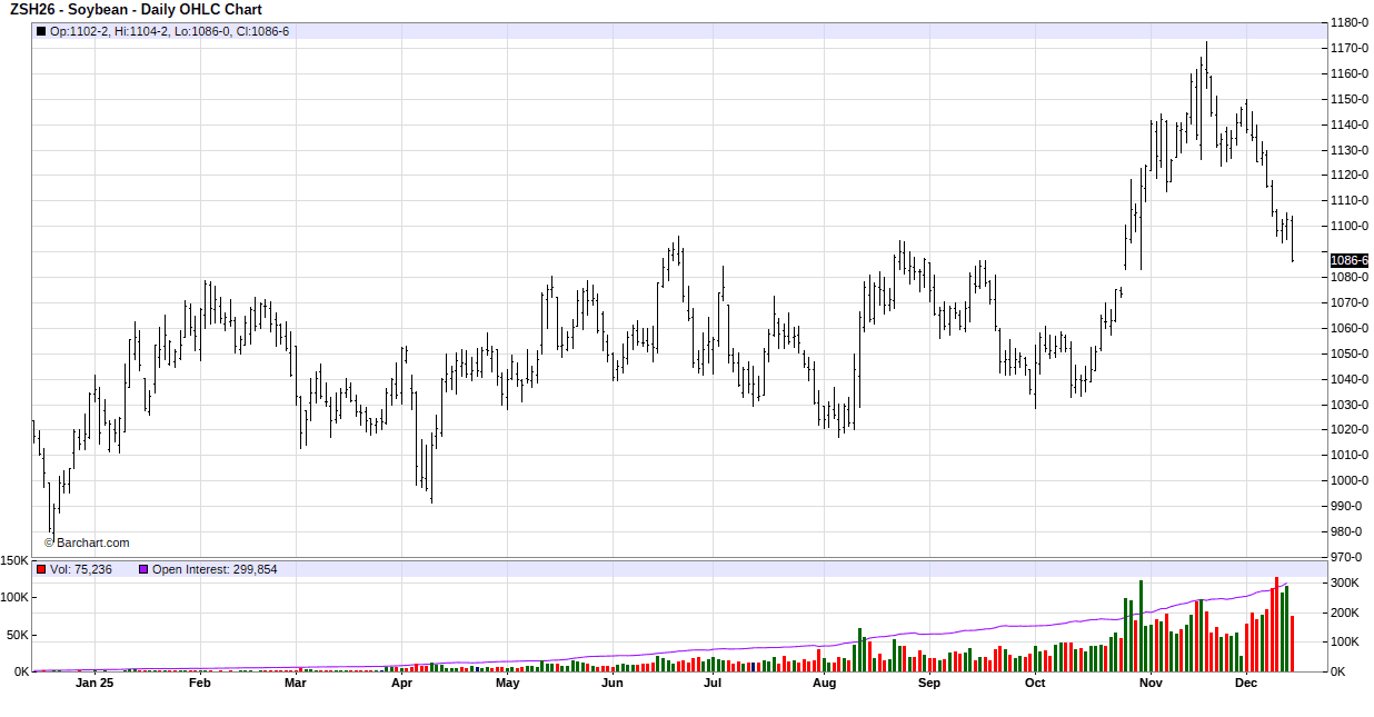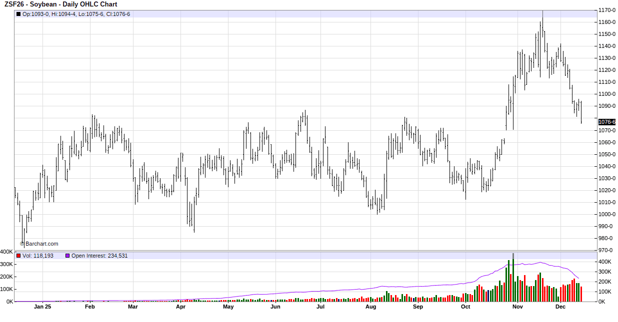 Soybeans were lower overnight but climbed higher throughout the day session and closed with small gains on Wednesday. Support came from more daily export sales announcements: 136,000 MT to China, two sales to unknown that totaled 331,000 MT, and 120,000 MT of soybean cake and oil to Poland. But gains were limited by confusion regarding the deadlines for China purchases. After the Trump/Xi meeting at the end of October, the White House said China would buy 12 MMT of US soybeans by the end of 2025. Treasury Sect. Bessent later moved the deadline to the end of February 2026. And now US Trade Rep Greer said the 12 MMT would be purchased by “the end of the growing season.” The administration has not clarified what the “end of the growing season” means, but some assume he was referring to the 2025/26 marketing year. China has purchased 2.98 MMT of US soybeans for the 2025/26 marketing year. There have been another 830,000 MT of sales to unknown since the end of October that likely are China.