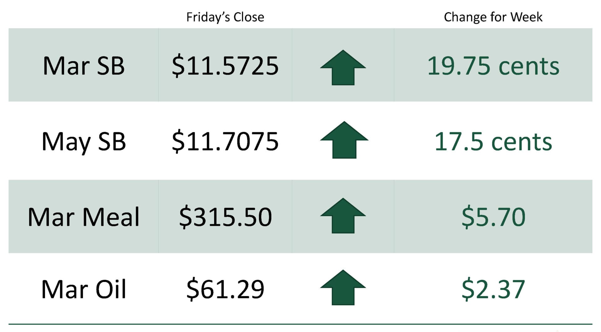 For the week, March soybeans were at $11.5725 up 19.75 cents while May soybeans were at $11.7075 up 17.5 cents. March soybean meal was at $315.50 up $5.70 and March soybean oil was at $61.29 up $2.37