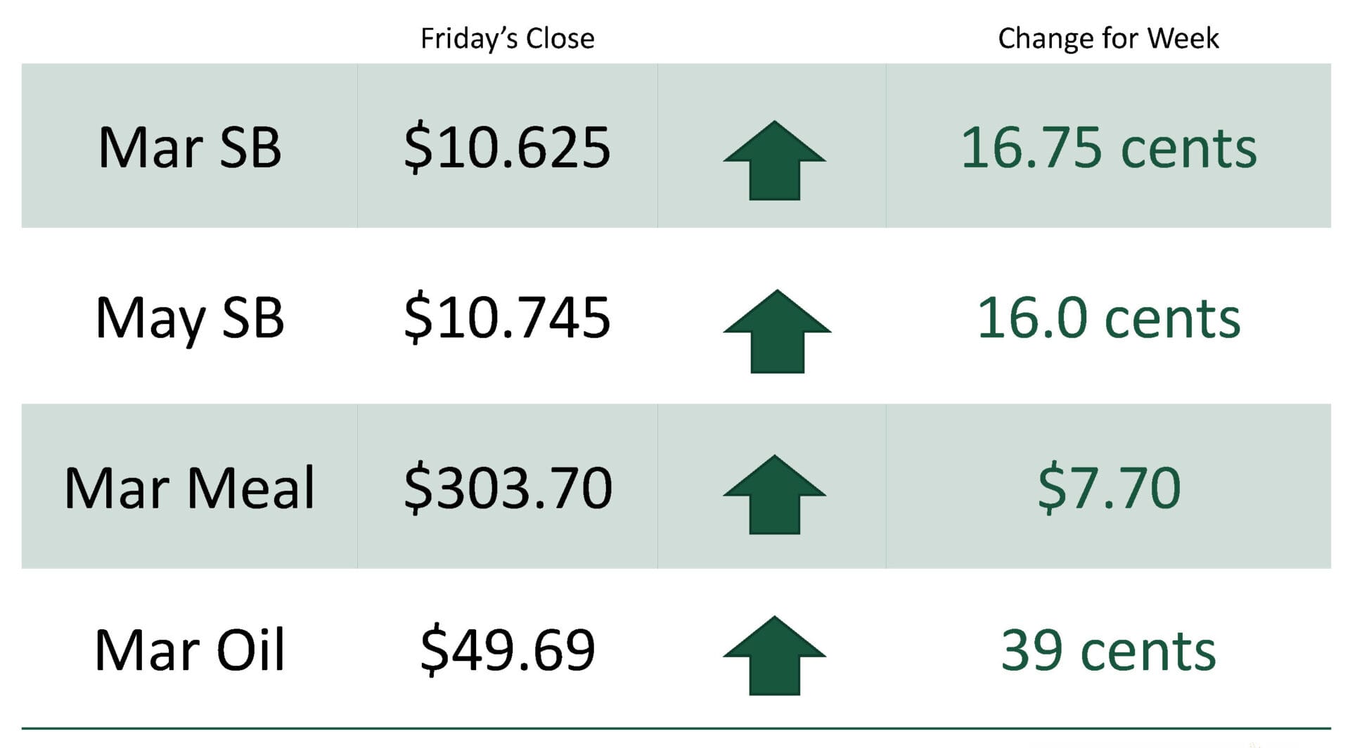 For the week, March soybeans were at $10.625 up 16.75 cents while May soybeans were at $10.745 up 16.0 cents. March soybean meal was at $303.70 up $7.70 and March soybean oil was at $49.69 up 39 cents.