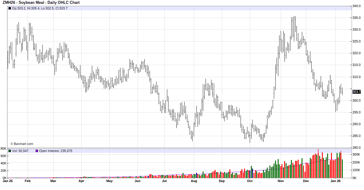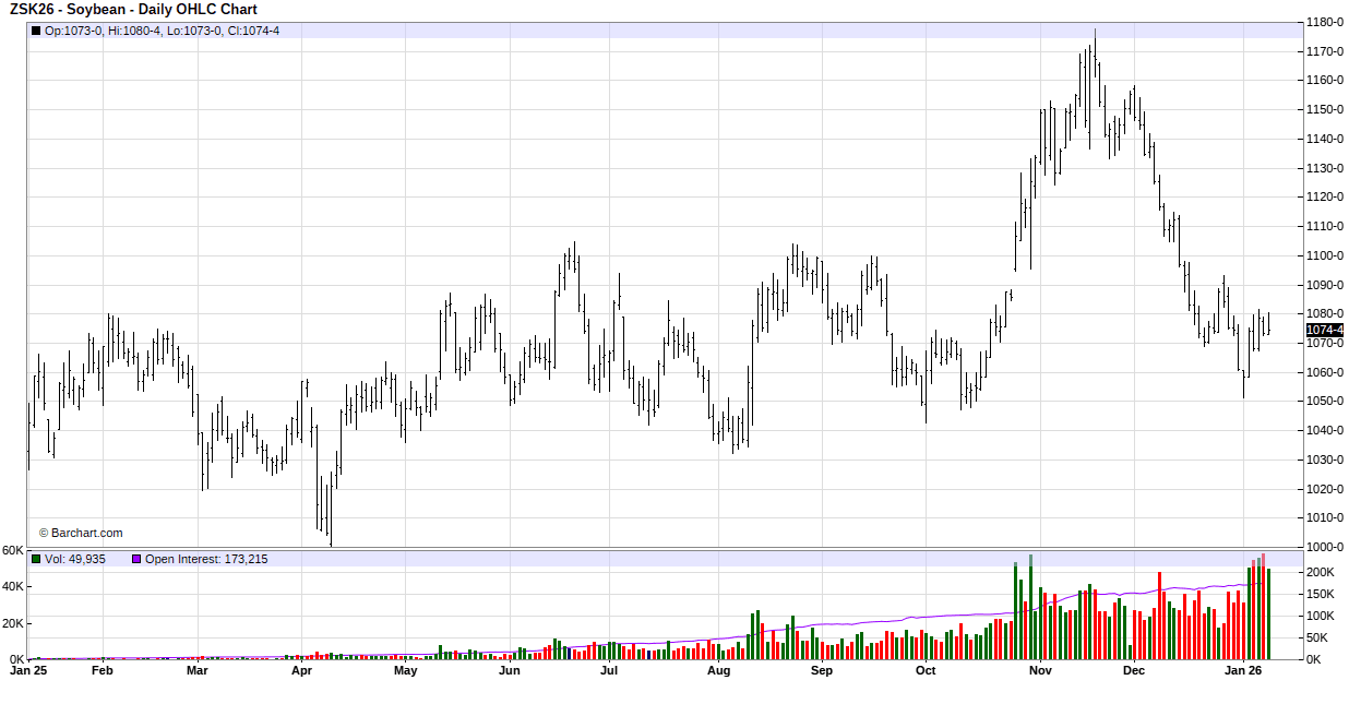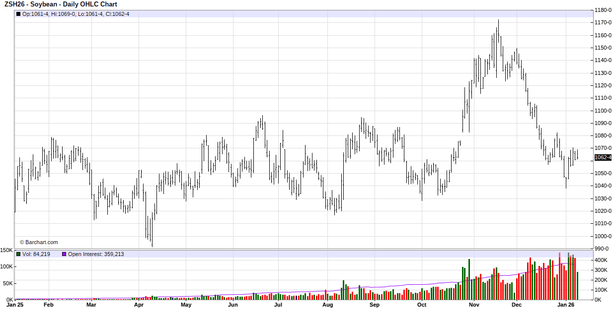 Soybeans traded on both sides of unchanged in a choppy session overnight and lost ground in the day session to close with small losses on Thursday. Pressure came from forecasts showing most of Argentina will see 1 to 3 inches of rain over the weekend and into early next week. USDA reported a sale of 132,000 MT of soybeans to China. USDA has now confirmed 7 of the 10 cargoes that China was rumored to by buying at the start of the week. Marketing year sales to China officially total 6.9 MMT but most traders believe the actual number is closer to 10 MMT when adding in sales to unknown destinations. Last week’s export sales were in the range of trade expectations. Marketing year to date sales are running 39% behind last year’s pace. Brazil expects its 2026 soybean exports to total 112 MMT vs. 109 MMT last year but also noted that exports to China are expected to drop 10 MMT to 77 MMT due to an increase in China’s purchases from the US.