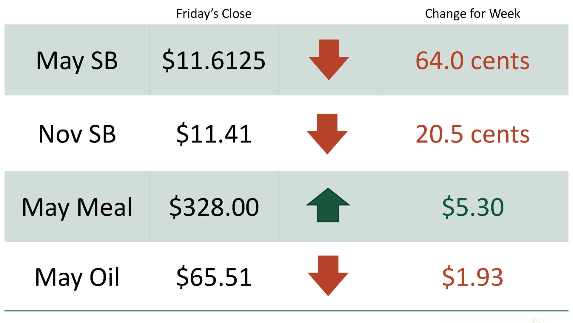 For the week, May soybeans were at $11.6125 down 64.0 cents while Nov soybeans were at $11.41 down 20.5 cents. May soybean meal was at $328.00 up $5.30 and May soybean oil was at $65.51 down $1.93.
