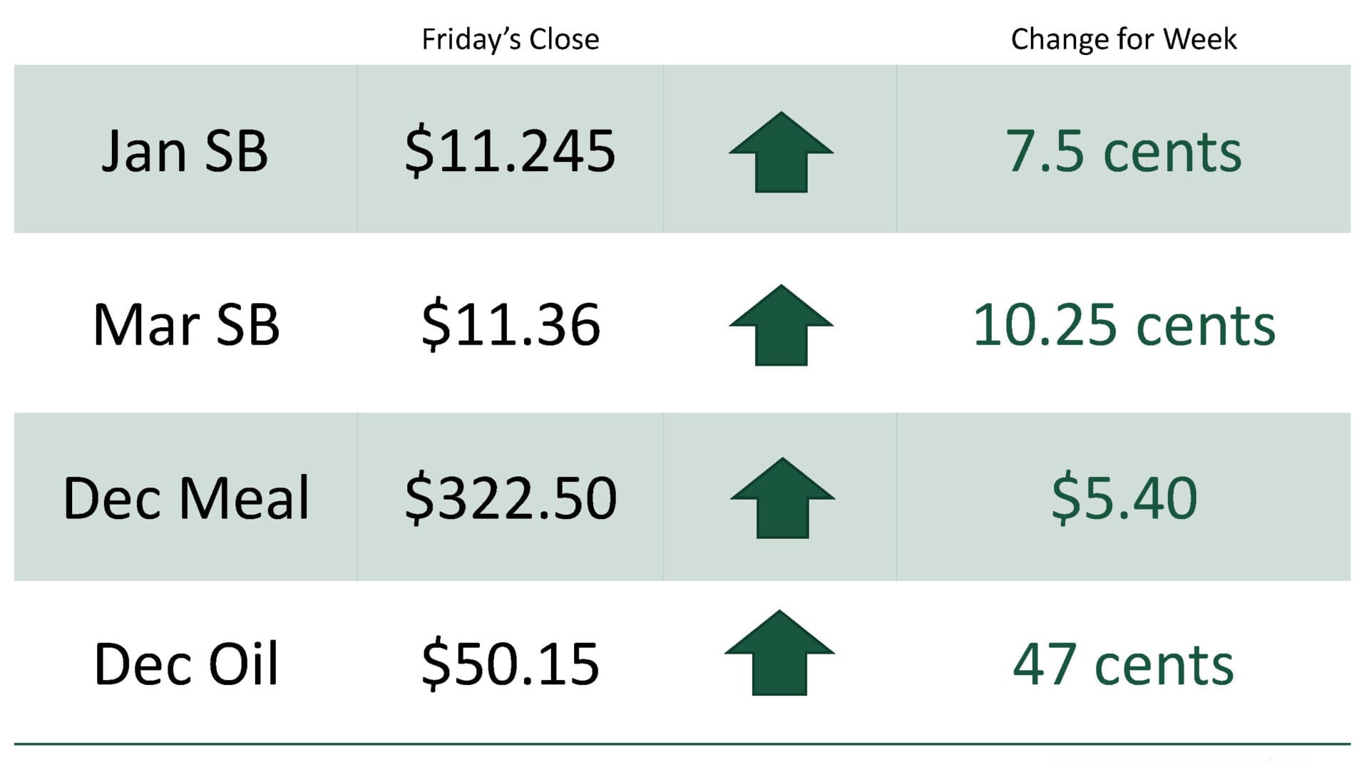 For the week, January soybeans were at $11.245 up 7.5 cents, while March soybeans were at $11.36 up 10.25 cents. December soybean meal was at $322.50 up $5.40 and December soybean oil was at $50.15 up 47 cents.