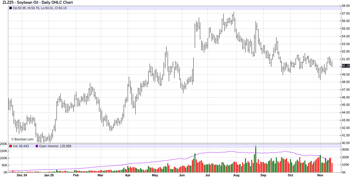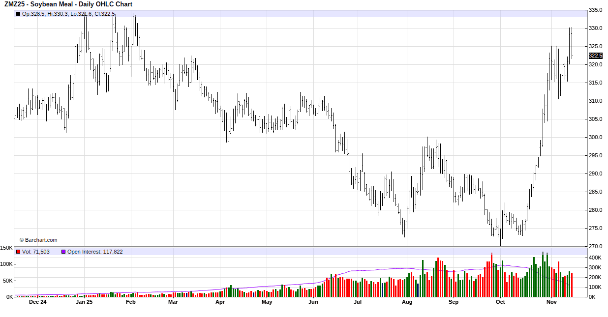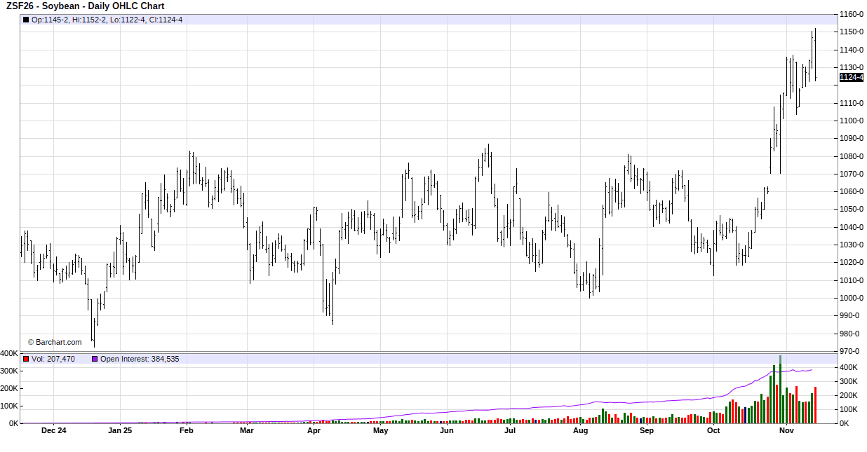 On Thursday soybean opened lower overnight but quickly turned higher and then added to the gains. The market continued to add to the gains in the day session and closed with double-digit gains and at new contract highs. Positioning ahead of tomorrow’s report and optimism that we’ll see strong export sales to China in tomorrow’s daily sales data dump supported soybeans. For the week ending 9/25/25, soybean export sales totaled 32.0 MB. USDA will release weekly reports twice a week until caught up. That is problematic for traders that want solid info on Chinese purchases. For example, without the shutdown, today’s report should have been for the week ending 11/6/25. But we won’t see that report until December 8. However, all daily reportable export sales (those over 100,000 MT to one destination) from Oct. 1 to Nov. 13 will be published tomorrow and that will clear up some of the uncertainty.
