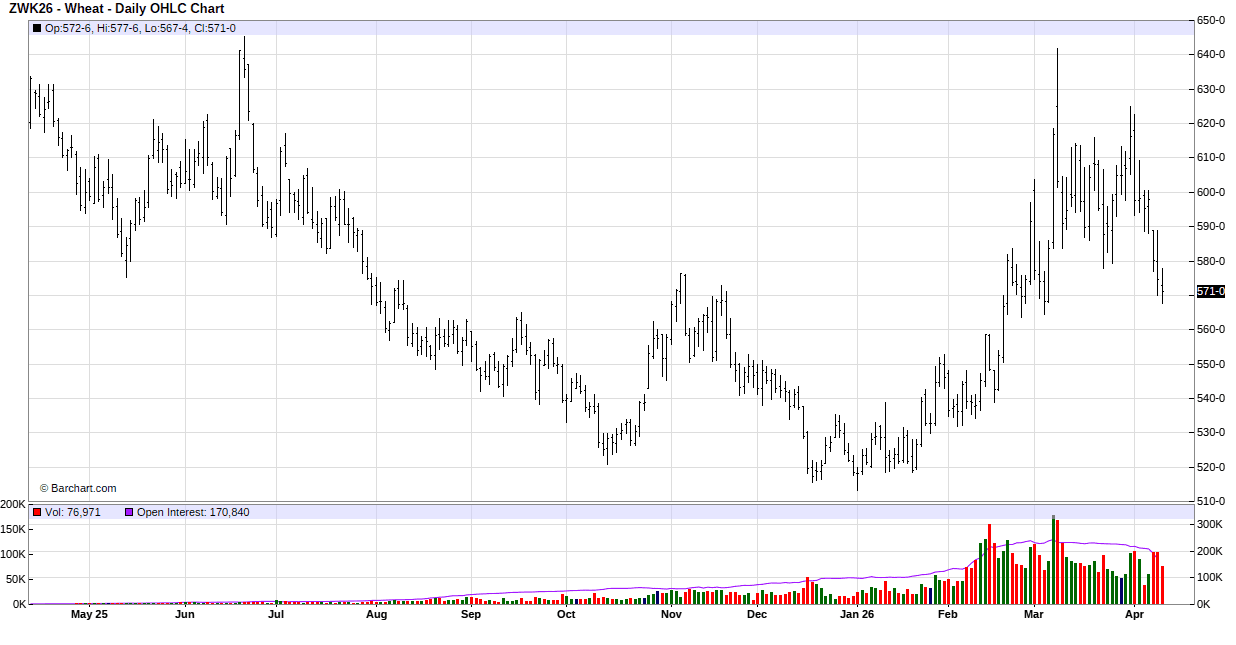Heavy selling hit the wheat market on Wednesday with all three wheat exchanges gapping lower on the opening and extended pressure throughout the session. Early selling was tied to news that the US has accepted the 2-week ceasefire deal with Iran. The Strait of Hormuz opening up is stipulation of the ceasefire, and until vessels are flowing through the Strait on a regular basis, the ceasefire won’t hold much water. Selling was also tied to weather forecasts calling for rain in the Southern Plains. All three forecasts, the 1 to 5 day, 6 to 10 day, and 11 to 15 day, have some form of rain in their forecast for the HRW wheat region. Technically wheat has slipped to a major support line. It will be important that lows hold, or wheat could see another leg down.