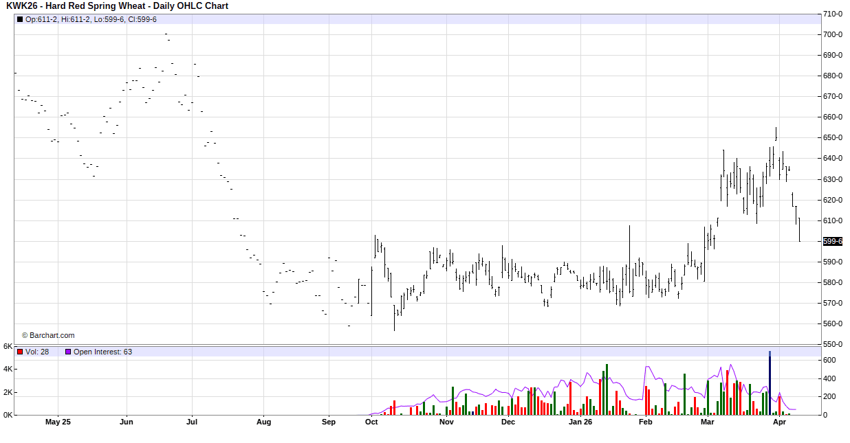 Wheat opened Tuesday’s session steady to higher but faded to post small losses throughout the overnight. A mixed performance came into play once the day session got under way with winter wheat seeing a mixed to slightly higher performance while spring wheat continued to trade with small losses. Uncertainty on the Iran war was the main driver. Winter wheat was supported by Monday afternoon’s Crop Progress report, which shows a poorer than expected crop. Light support was due to weather forecasts calling for little to no rain for the Southern Plains winter wheat region.