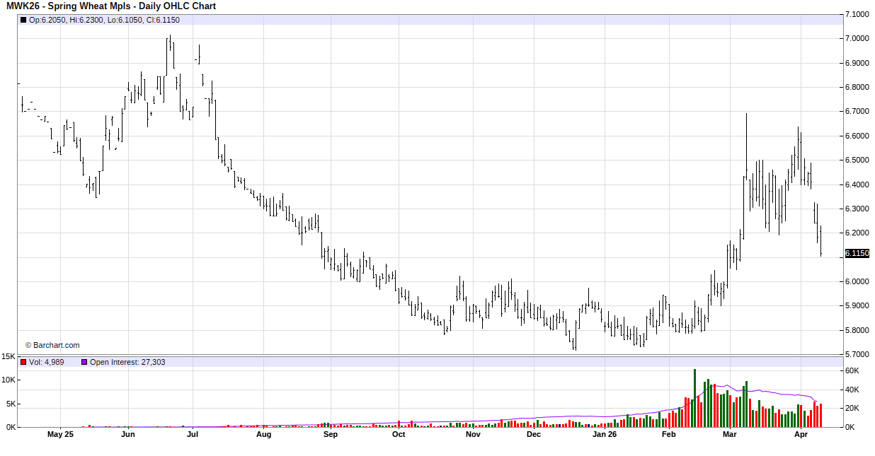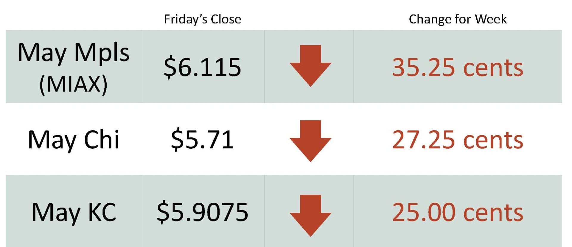 For the week, May Mpls MIAX was at $6.115 down 35.25 cents, May Chicago was at $5.71 down 27.25 cents, May KC was at $5.9075 down 25.0 cents.