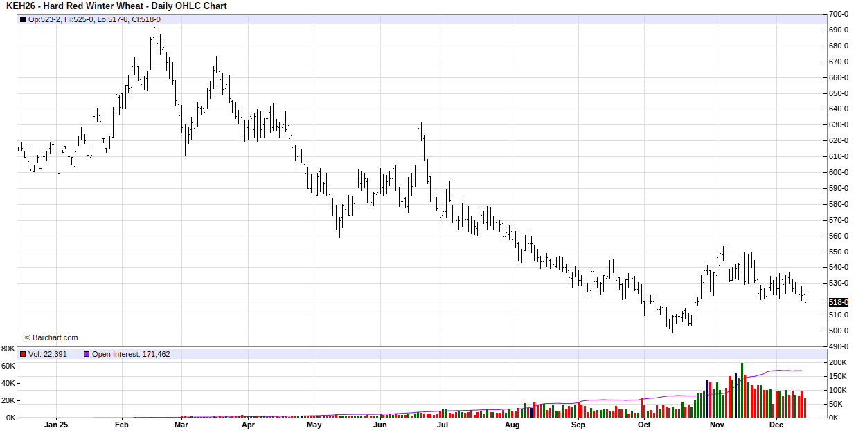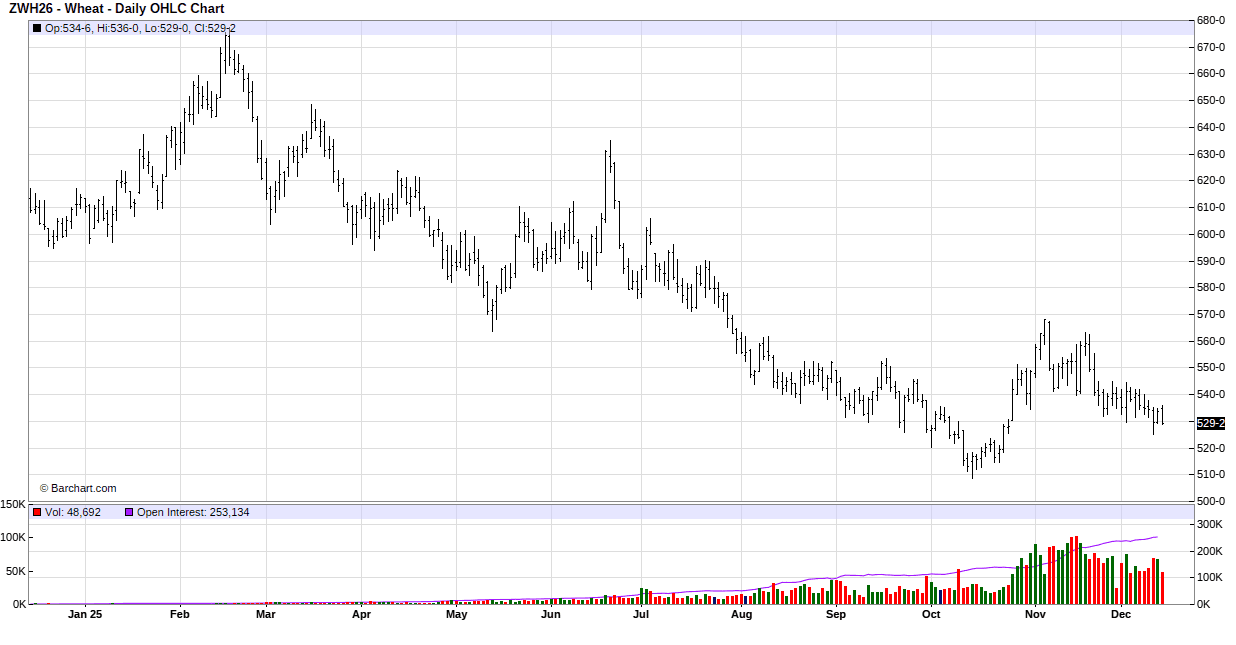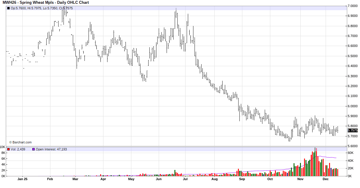 Wheat started the week by opening steady in the Mpls exchange but lower in winter wheat. By the time the night session was drawing to a close, wheat had firmed with Mpls and Chicago pushing higher while KC remained on the defense. Position squaring and the evening up of positions ahead of Tuesday’s Dec Crop Production report was the main driver early. Early support came from USDA’s 10-year Baseline projections calling for 2026 wheat planted acreage to be at 44 million vs 45.3 million last year. Stocks are estimated to be at 832 MB vs 901 MB last year. Ukraine officials are projection wheat production at 23.2 MMT vs 22.7 MMT previously and they are estimating 2026 production to be near 23.9 MMT, the highest since Russia invaded. Traders are not looking for a big change in wheat’s numbers tomorrow, just maybe a slight increase in exports since exports are running about 21% ahead of last year at this time.