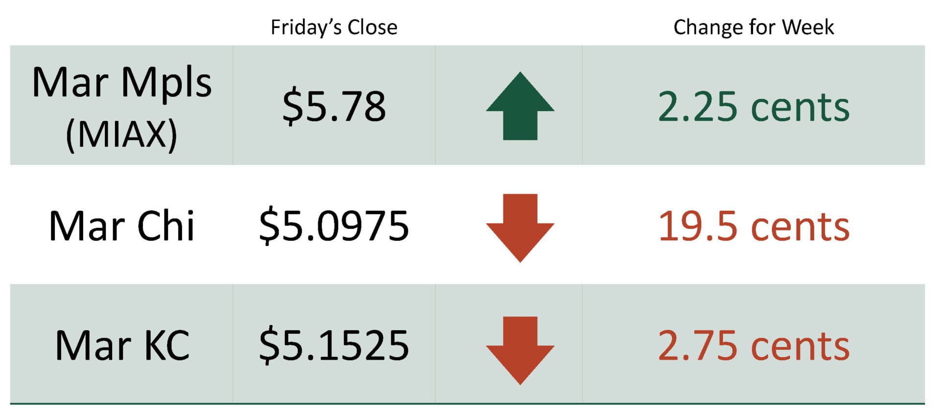 For the week, March Mpls MIAX was at $5.78 up 2.25 cents, March Chicago was at $5.0975 down 19.5 cents, March KC was at $5.1525 down 2.75 cents.