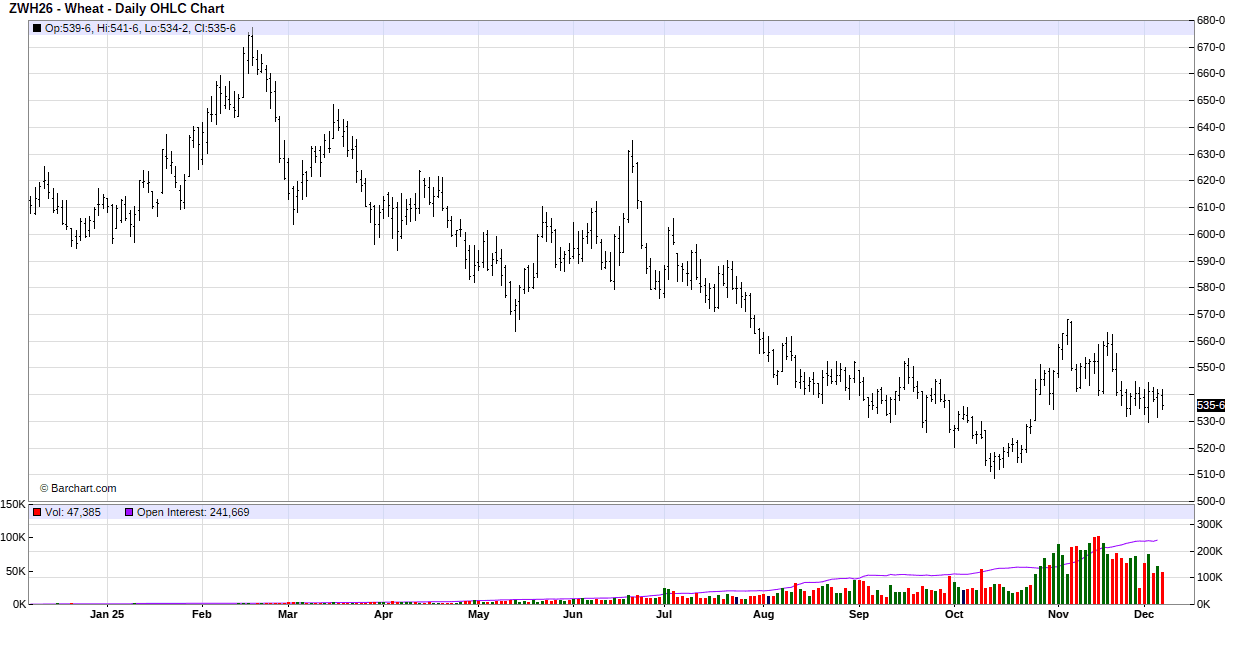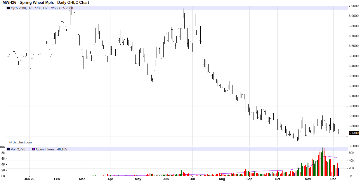 To start the week wheat opened steady to higher but slipped into the red for most of the night. Technical buying helped wheat turn positive at the start of the day session but the pressure from the lower corn and soybean markets proved to be too much for the wheat bulls to overcome. Class spreading was the main focus of traders’ attention early in the session as traders unwound long winter wheat short Mpls wheat spreads. Once the spread activity dried up, wheat fell prey to spill over pressure from the lower corn and soybeans complex. Light selling was also due to concerns that the war in Ukraine could be drawing to a close, which would result in Russian sanctions to be lifted. ABARES is not estimating Australia’s wheat production at 35.6 MMT vs 33.8 MMT previously. USDA is already at 36 MMT. Argus is estimating Russia’s 2026 wheat production at 86.5 MMT vs 88.4 MMT last year.