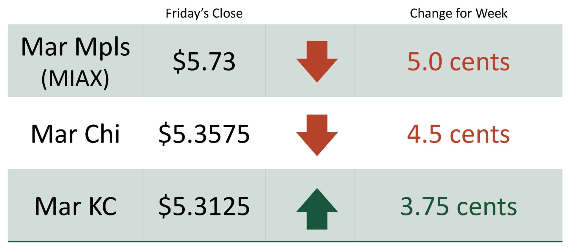 For the week, March Mpls MIAX was at $5.73 down 5.0 cents, March Chicago was at $5.3575 down 4.5 cents, March KC was at $5.3125 up 3.75 cent.