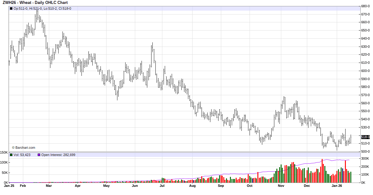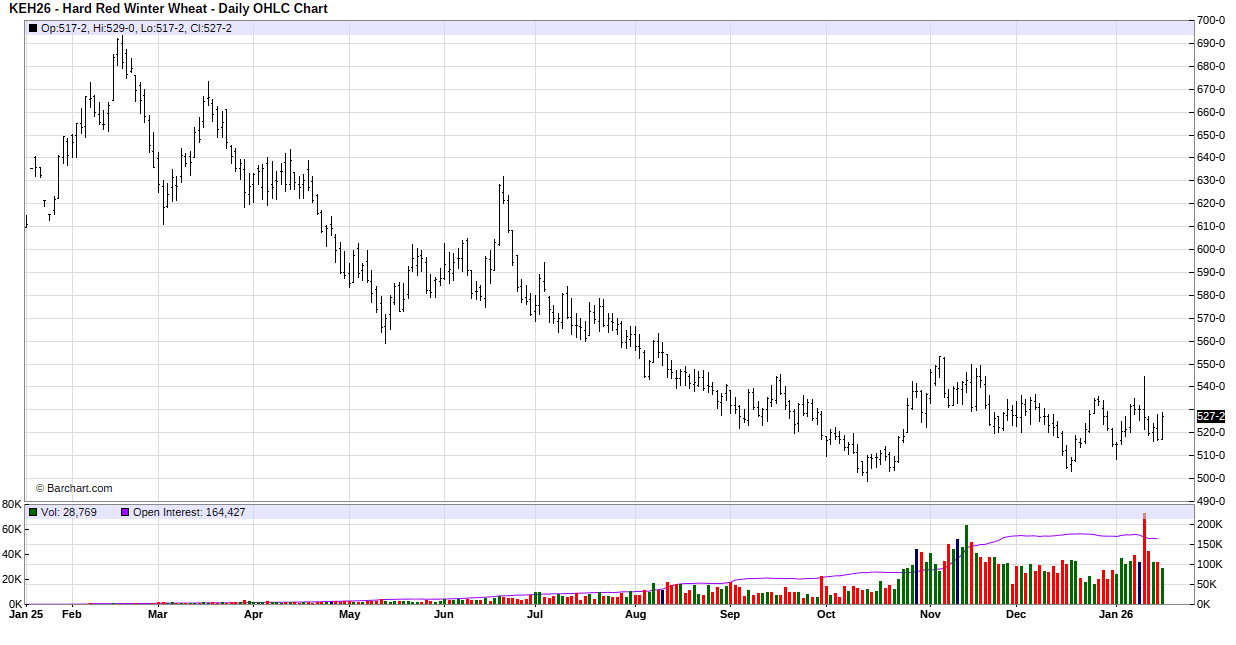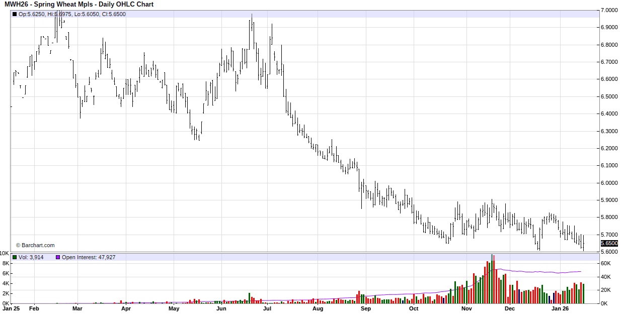 For the week, March Mpls MIAX was at $5.65 down 2.5 cents, March Chicago was at $5.18 down 0.75 cent, March KC was at $5.2725 down 3.0 cents.
