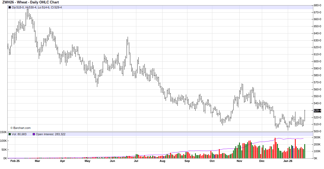 In Thursday’s session wheat opened steady to higher and held onto gains throughout the night and even extended session gains once the day session started. Early support came from weather forecasts calling for adverse winter conditions for much of the Southern Plains. Light support came from the news that the administration has backed away from imposing tariffs on the countries that were opposed to the acquiring of Greenland. Technical buying was also noted as wheat bounces off the low end of its recent trading range.