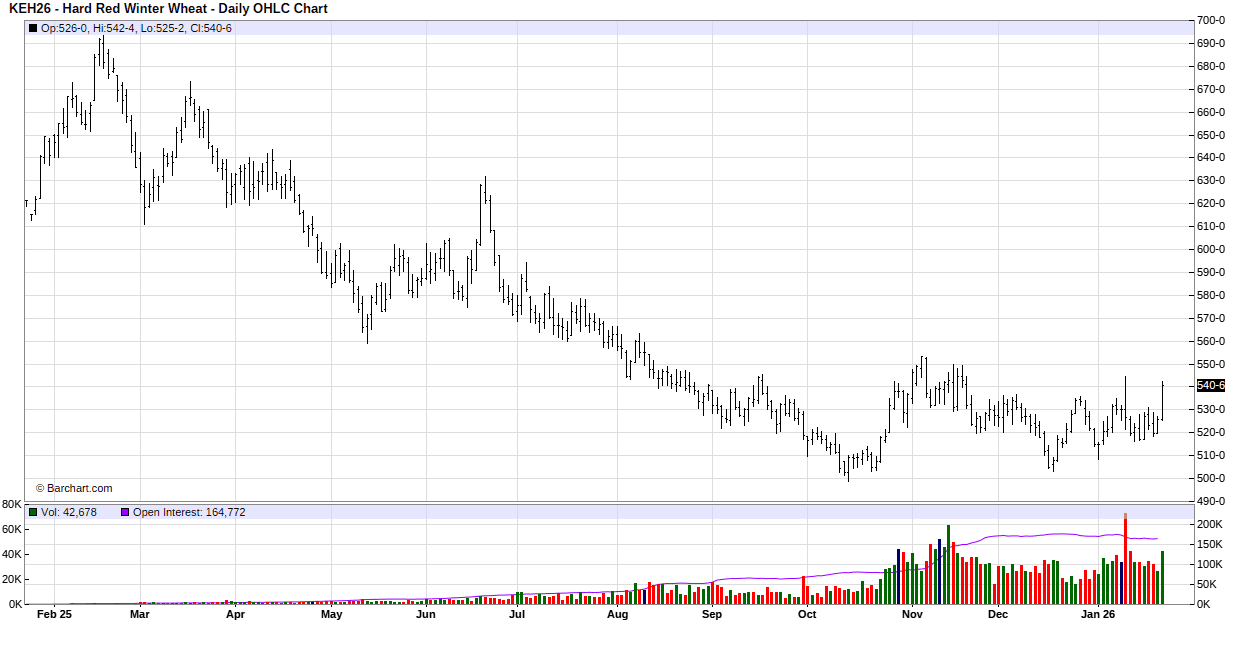 After the long weekend, all of the wheat markets closed lower with Chicago seeing the biggest losses on Tuesday. Pressure came from forecasts for rain and snow for the US Southern Plains. In world export news, a couple of big sales were reported with Saudi Arabia buying 907,000 MT of Black Sea wheat and Algeria buying 600,000 MT of wheat sourced mainly from Argentina. China imported 4.0 MMT of wheat in 2025 vs. 11.2 MMT in 2024 due to increased domestic production. Last week’s export shipments were the highest in 4 weeks, and marketing year-to-day shipments are running 20% ahead of last year’s pace.