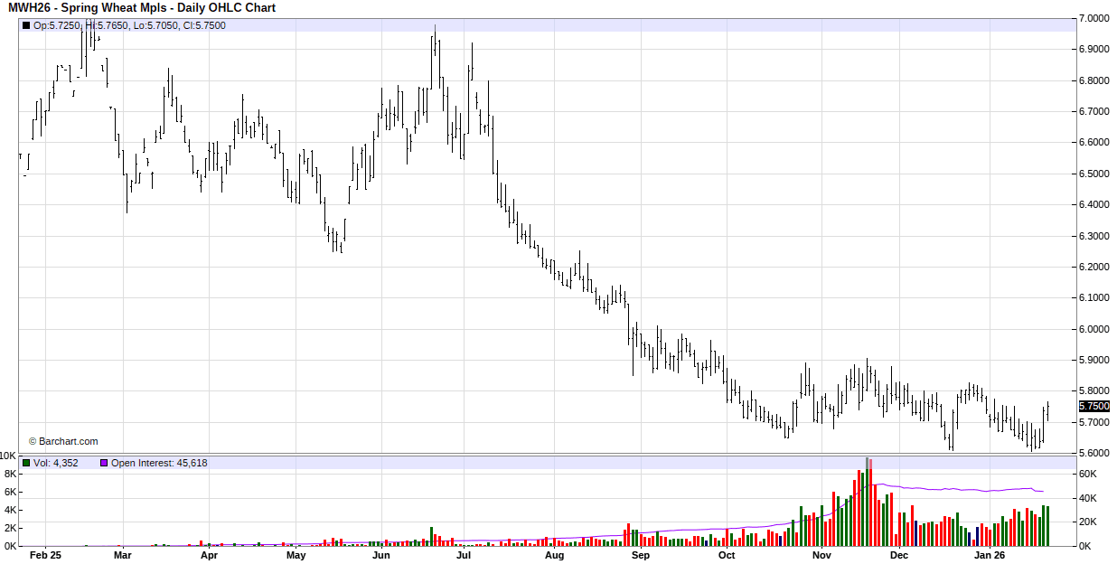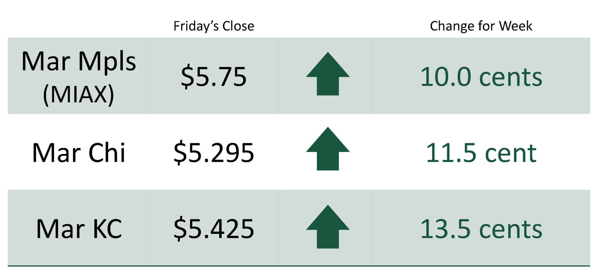 For the week, March Mpls MIAX was at $5.75 up 10.0 cents, March Chicago was at $5.295 up 11.5 cents, March KC was at $5.425 up 13.5 cents.