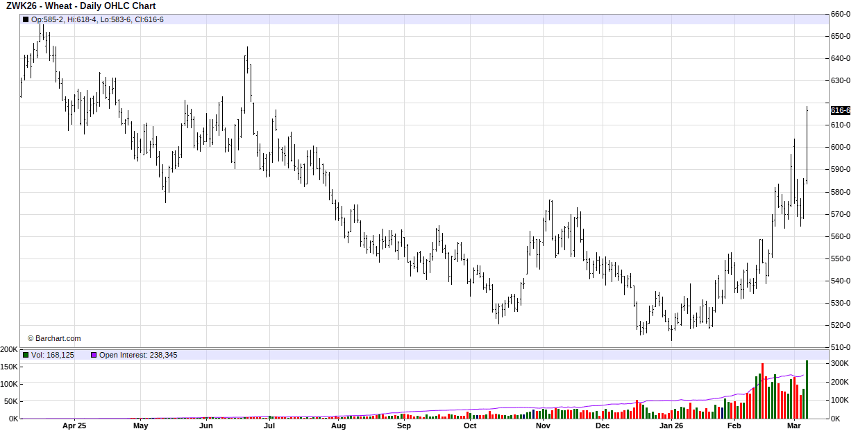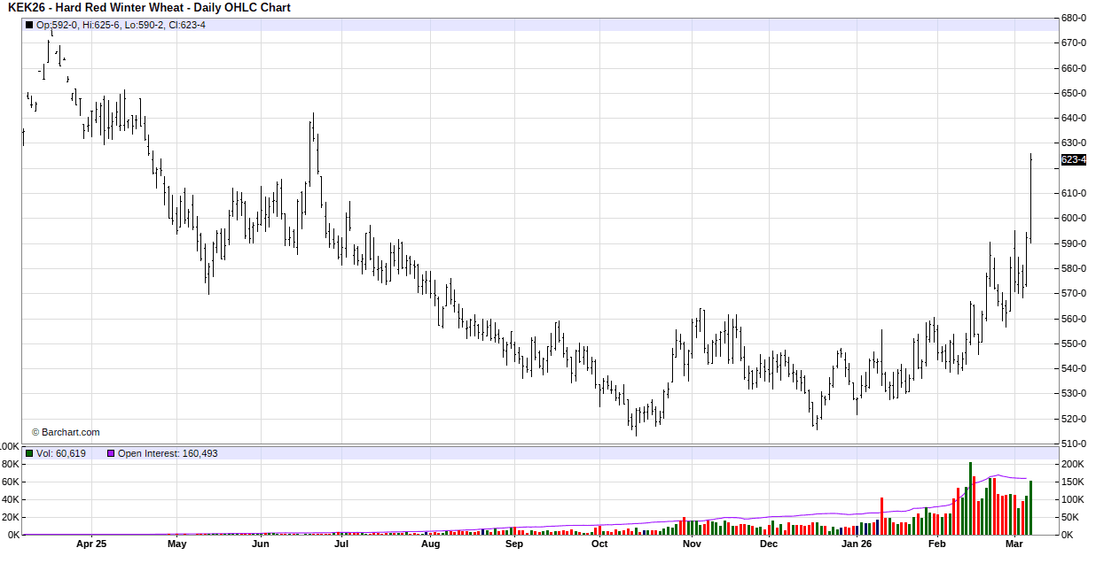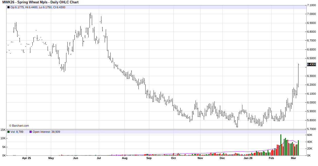 To start the week wheat gapped higher on the opening bell with support coming from the military action against Iran. Logistic concerns were the main supporting factor as it appears that the Strait of Hormuz will see limited vessel traffic due to the war. The base price for crop insurance for HRS wheat was $6.19 vs $6.55 last year. According to last week’s Drought Monitor map, 50% of the nation’s winter wheat crop is in some stage of drought. Canada is reporting wheat exports for the year up 10% year over year.
