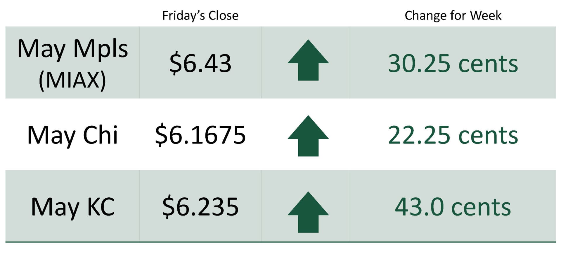 For the week, May Mpls MIAX was at $6.43 up 30.25 cents, May Chicago was at $6.1675 up 25.25 cents, May KC was at $6.235 up 43.0 cents.