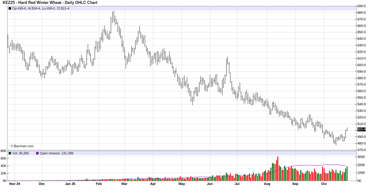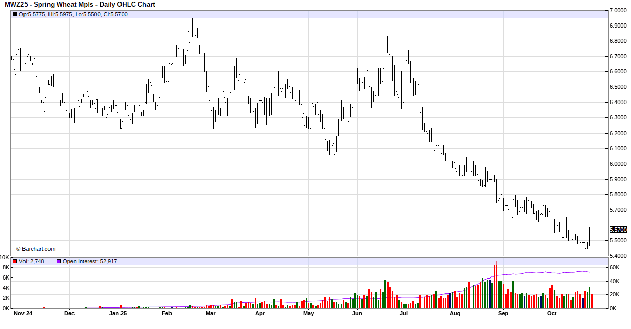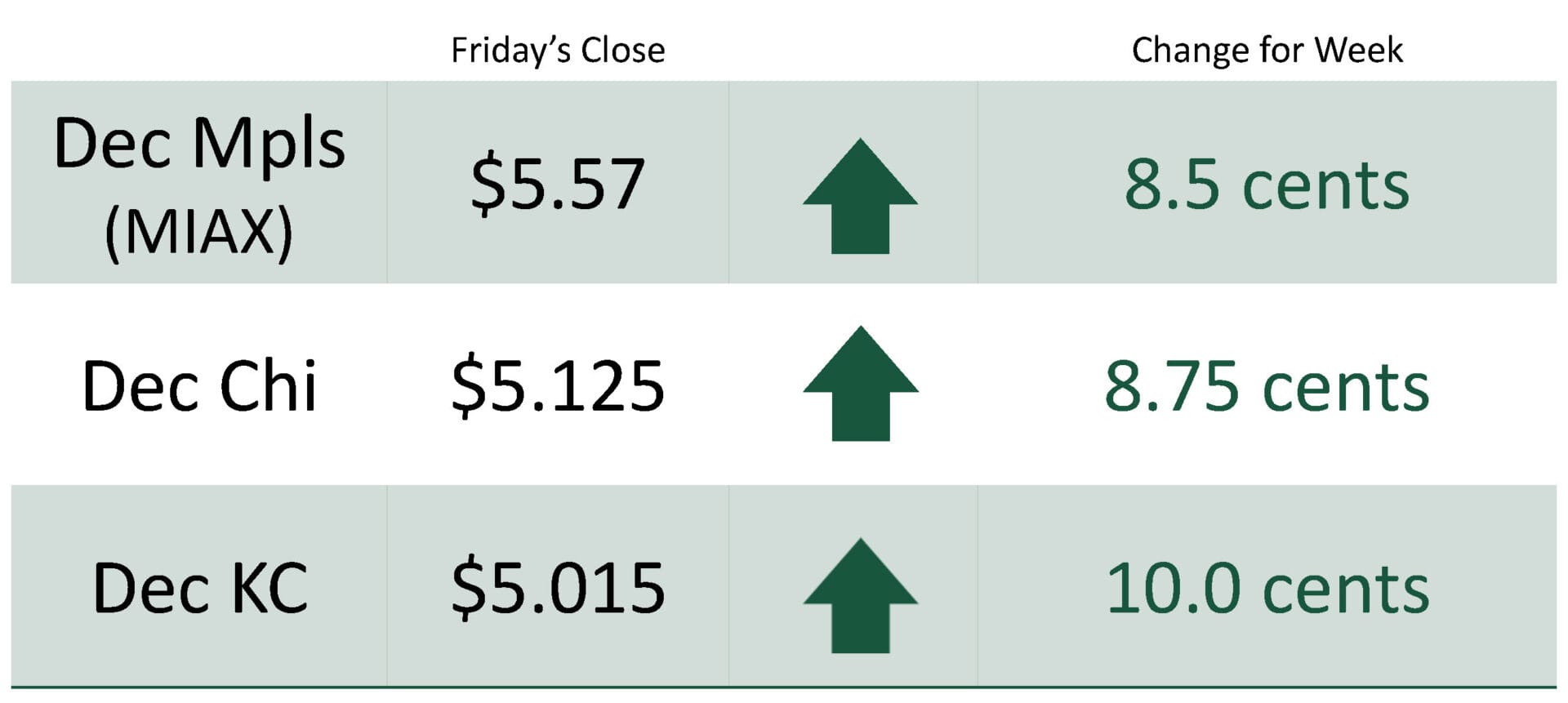 For the week, Dec Mpls MIAX was at $5.57 up 8.5 cents, Dec Chicago was at $5.125 up 8.75 cents, Dec KC was at $5.015 up 10.0 cents.